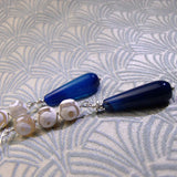 Long blue drop earrings with a long blue agate semi-precious bead dangling under a stack of round white agate beads.