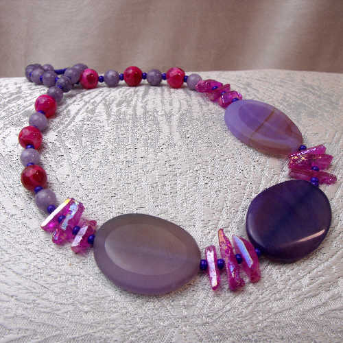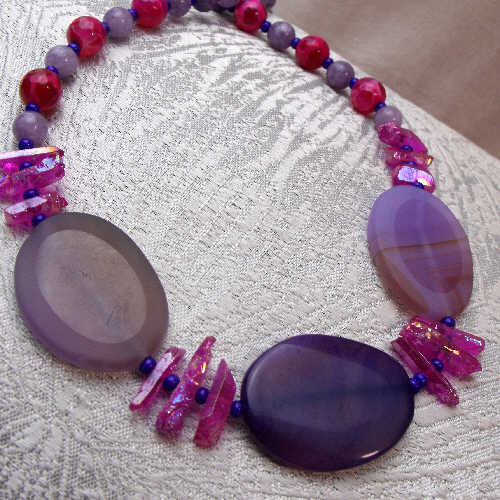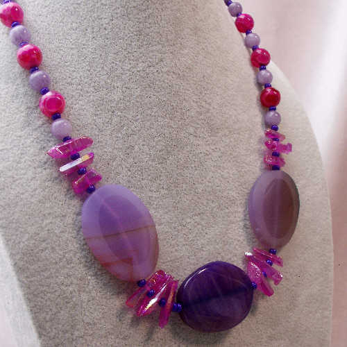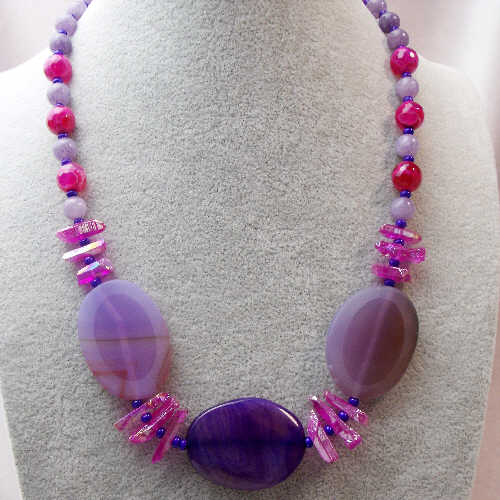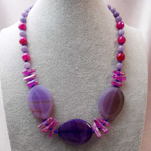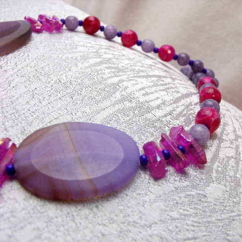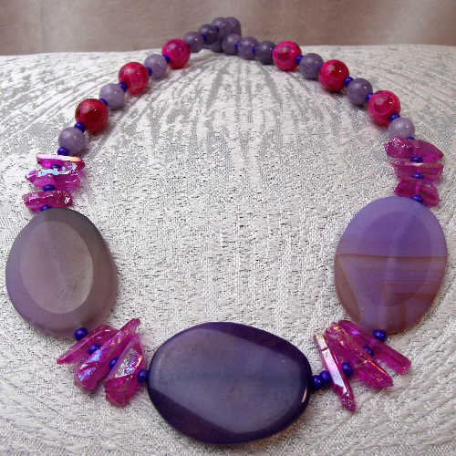 I have created this purple and pink chunky semi-precious bead necklace from large chunky purple oval shaped semi-precious agate beads and I have spaced these chunky semi-precious beads with nuggets of a bright pink semi-precious crystal.