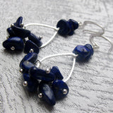 At the base of these long semi-precious lapis lazuli earrings drops a teardrop hoop where clustered together sit beautiful deep blue coloured lapis lazuli nuggets.