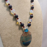 In the centre of this pendant necklace you will see alternating blue agate semi-precious beads and opal quartz semi-precious beads and I have spaced these quartz and blue agate beads with tiny nuggets of the semi-precious stone carnet, I have used the semi-precious garnet nuggets to compliment the veins in the blue agate pendant.